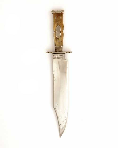 AN ALEXANDER, SHEFFIELD, LARGE BOWIE-KNIFE WITH NICKEL-PLATED MOUNTS, circa 1865, with 10 3/4in. clip-point blade false edged for all but 2 1/2in., flat forte heavily stamped in large letters 'ALEXANDER' over 'SHEFFIELD', flat nickel-plated cross-guard with crescentic terminals, slab-sided horn grips pinched in the centre and held by three pins, central white-metal 'moustache' escutcheon, grooved bolster to the front and tri-lobed 'crown' pommel, no scabbard