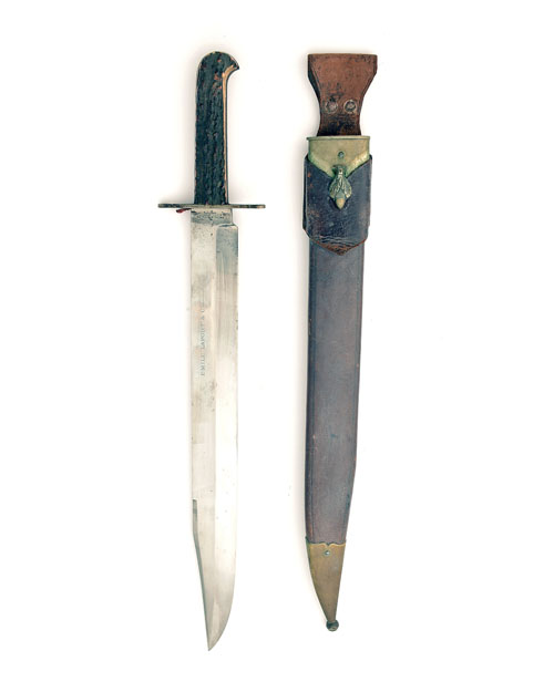 circa 1890, with 15 3/4in. narrow clip-point blade false-edged for the last 5 3/4in., the left hand side of blade signed 'EMILE LAPORT & CIA', the ricasso stamped 'EMILE LAPORT & CIA, RIO DE JANEIRO' NICKEL-plated boat-shaped cross-guard with flat rounded quillions (remnants of a red felt buffer), full-length tang and natural staghorn scales with beaked pommel held by three pins TOGETHER WITH its brown leather scabbard with nickel-plated mounts, carved oak leaf and acorn frog-button and associated leather belt-frog