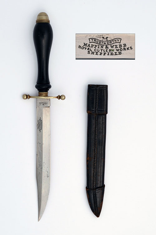 circa 1900, with 6 3/4in. blade false edged for the last 4in., the side of the blade marked 'M' over 'TRUSTWORTHY' within a banner and signed beneath in a crescent 'MAPPIN & WEB, ROYAL CUTLERY WORKS, SHEFFIELD', the forte also marked 'M' and 'TRUSTWORTHY', German silver boat-shaped cross-guard with ball quillions, turned coin-edged ferrule, turned ebony hilt with swollen pommel with a German silver 'beehive' coin edged pommel-cap, TOGETHER WITH its black leather reinforced scabbard with belt-loop (some wear to scabbard)
