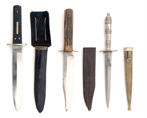 THREE COLLECTABLE KNIVES, THE FIRST SIGNED PEARCE & CO, SHEFFIELD, of bowie type, with 6in. clip-point blade false edged for half its length, plain brass boat-shaped guard and natural antler scales held with three brass pins, the second signed 'BOWMAN CUTLERY CO', the blade stamped 'Q-E-D', of similar dimensions to the first but spear-point blade, nickel cross-guard and moulded dark horn scales, both with their respective leather scabbards, the last of stiletto form, possibly continental, with 5 3/4in. blade, nickel-plated 'S' shaped guard, turned plated hilt with moulded decorated bands and swelling towards the domed pommel, complete with its brass scabbard with machined roll engraving, nickel chape, ball finial and carved mask frog-button