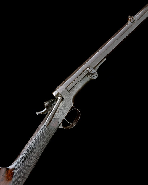 circa 1865, with 26in. octagonal barrel signed 'JNO. RIGBY & CO. DUBLIN & LONDON.' on the top-flat, beaded blade fore-sight, rear-sight of one standing and two folding leaves, platinum-inlaid centre-line, scroll engraved breech and action, the latter signed on the left side in gothic script within a banner 'WM & JN. RIGBY.', central hammer (nose replaced, no pin), butter-knife bolt-handle (loose), figured walnut stock with chequered grip, no provision for fore-end, external automatic extractor, the underside of barrel further numbered '1024', some patchy surface corrosion