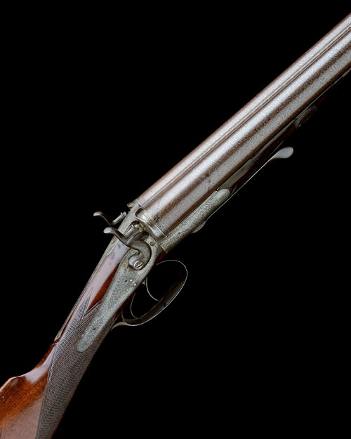 likely conversion from pinfire, 29 1/2in. black powder only bold damascus barrels, rib engraved '2' and 'BOSS & CO. 73 ST. JAMES'S STREET. LONDON.', 2 1/2in. chambers, bored approx. true cyl. in both, heavily pitted internally, action incorporating later development of Casimir Lefaucheux patent forward facing underlever, patent no. 5183 granted 13th March 1833, carved serpentine fences of pinfire form, non-rebounding back-action locks, replacement crosspin, border and fine acanthus scroll engraving, some wear and patination overall, 14 3/8in. stock including steel buttplate, fore-end with some damage, weight 6lb. 8oz.