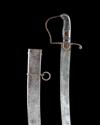 circa 1810, with broad strongly curved 32 1/2in. hatchet-tipped blade, stirrup hilt with turned down quillion and twin langets, ribbed leather grip (wire binding absent), plain curved pommel with reinforcing side-pieces, complete with its iron scabbard, maker marked at the neck and engraved 'C.M MENZIES, CARR BRIDGE', the whole with surface staining