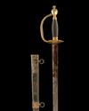 T. WILTSHIRE, LONDON GEORGIAN ENGLISH INFANTRY OFFICER'S SWORD WITH BLUE AND GILT BLADE, circa 1780, the straight single-edged 32 1/2in. blade with broad full-length fuller, the first third of the blade lightly engraved with arabesques and the cypher and coat of arms of George ? on a blue and gilt ground (losses and wear), gilded double oval-shell guard carved with 'kidney-bean' recesses and a relief floral border around the blade, gilded 'D' shaped knuckle-bow (quillion broken off and missing), faceted urn pommel and wire-bound grip, complete with its black leather scabbard with gilded mounts, the throat engraved 'THO'S WILTSHIRE, SWORD CUTLER, 46 LOMBARD ST, LONDON', twin suspension rings, scabbard and mounts worn