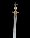 circa 1800, with slightly curving plain single-edged 30 1/2in. blade, iron hilt of typical form with disk pommel and symmetrical quillions, the entire hilt covered in fine gold koftgari arabesques (some losses to gilding, no scabbard)