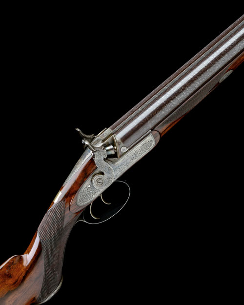 circa 1846, with 29 1/2in. browned twist barrels signed 'GEORGE & JOHN DEANE, No. 30 KING WILLIAM STREET, LONDON BRIDGE on the top-rib, silver fore-sight, scroll engraved case-hardened patent breeches, finely engraved tang decorated with scrollwork and a pheasant and retaining traces of original blued finish, finely engraved signed locks each decorated with scrollwork and a pointer all within a roped border, case-hardened scroll engraved Deane Patent hammers, finely figured walnut half-stock, chequered grip and fore-end, finely scroll engraved mounts including blued trigger-guard decorated with a pointer, shield-shaped gold escutcheon engraved with a crest, original white metal mounted ramrod with worm-end, much original finish throughout, London proof marks,TOGETHER WITH its manufacturers original mahogany fitted case lined in tooled leather with accessories including a Hawksley powder-flask, a leather bodied shot-flask, additional loading and cleaning rod with detachable handle, turn-screws, oil-bottle, embossed cap-tin plus other sundry cleaning items, the lid with George & John Deane trade label, the exterior with circular brass escutcheon and flush-fitting carrying handle
