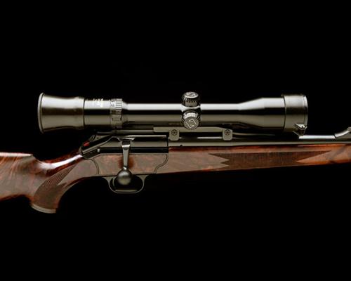 22in. nitro barrel with block-mounted open sights and ramp-mounted blade fore-sight, the receiver mounted with a Zeiss Diavari-ZM 1,5-6x42 T* telescopic sight in quickly-detachable mounts, black finish, the receiver with wooden side panels, highly-figured pistolgrip stock with sculpted cheekpiece, hogsback comb, sling swivels, 14 1/2in. pull including buttplate, in its Blaser take-down case