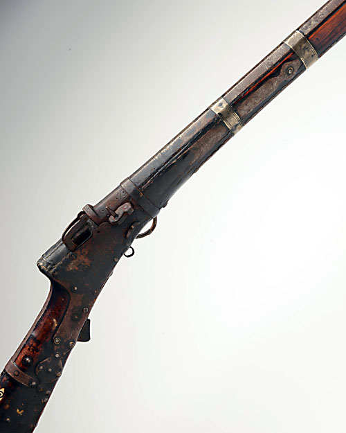 A 28-BORE MATCHLOCK MUSKET 'TORADOR', Indo-Pakistani circa 1850, with octagonal 49 1/2in. barrel of etched damascus, some engraved detail, hardwood three-quarter stock with plates fitted around the action, large root-ball heel-plate and sheet white-metal barrel-bands with larger nose-cap