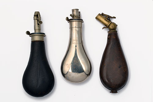 all circa 1840-50, the first signed 'JAMES DIXON & SONS SHEFFIELD', with a leather-covered iron body, nickel furniture, the nozzle (loose) adjustable to seven ungraduated positions and designed for a large-bore rifle (Riling 1405), the second by the same maker and for shot, with brass three-position nozzle articulated with a 'crab-claw' joint (Riling 1457), the last signed 'SYKES PATENT', re-nickel-plated body engraved with an armourial of a cockerel stood on a wreath, the charger nozzle hinged in the reverse position and adjustable between 2 1/2 and 3 drams (nozzle similar to Riling 1410)