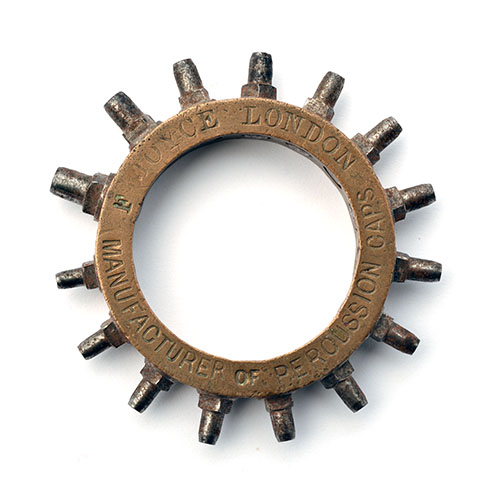 circa 1855, used for establishing the size of required cap, manufactured as a brass ring fitted with dummy nipples of graduating size around the circumference and signed 'F. JOYCE LONDON, MANUFACTURERS OF PERCUSSION CAPS' on one side, the reverse side with the identification numbers relevant to the cap-size