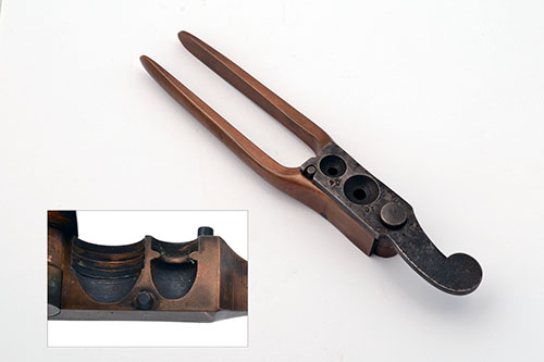 circa 1864, in bronze and of scissor form with radiused edges, the interior cavities to throw a lubricated 54-bore round-nose bullet, the second cavity to throw a patched 16-bore short round-nosed bullet, the iron sprue-cutter stamped '54' and '16'