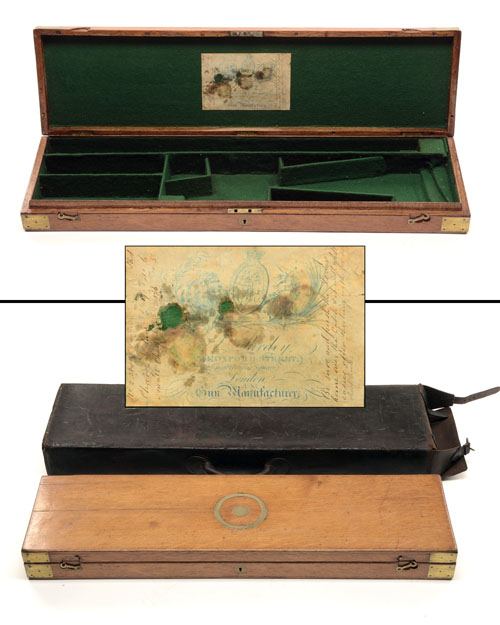 A BRASS-CORNERED OAK PERCUSSION GUNCASE,