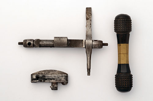the first circa 1853 and for a Pattern '53 musket, of 'T' bar form with ordnance stamps (missing worm-end), the second, smaller and possibly Continental with various folding accessory blades, nipple-key and spring clamp, the turnscrews possibly from a pair of pistols, with swamped octagonal brass-mounted bodies and chequered ebony handles (one age cracked)