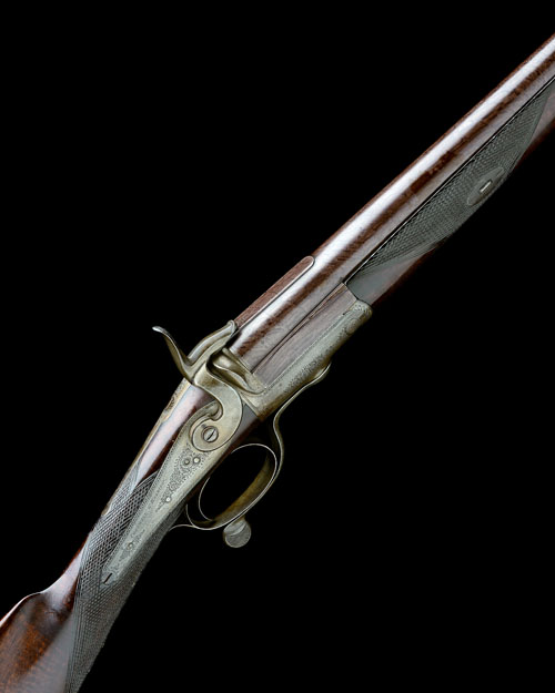 circa 1875, with browned damascus 28in. barrel, short sighting rib carved to the breech-end, the barrel signed 'COGSWELL & HARRISON 223 &224 STRAND LONDON', bead fore-sight, rounded borderline and scroll engraved action with 'Jones' type swing under-lever, borderline and scroll engraved back-action lock signed 'COGSWELL & HARRISON', figured walnut butt-stock chequered at the wrist, chequered splinter fore-end, traces of original finish to action and furniture parts