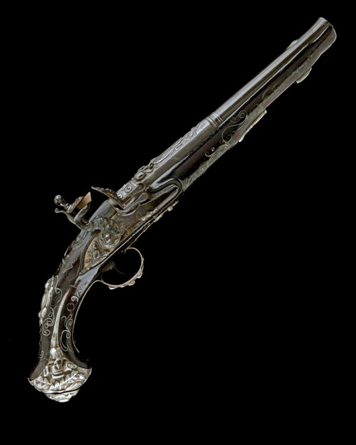 circa 1760, with strongly swamped 11in. barrel, applied silver heart-shaped fore-sight, moulded bands to the central section, the breech portion with flat sides and a deeply relief-chiselled marshal and flag trophy with a central carved obelisk surmounted by a crescent device within a sunburst and with carved rococo scrolls beneath, the top-tang with borderline engraving, central sighting groove and engraved foliage to the tip (traces of gilding), radiused lock with relief chiseled marshal trophy to the tail on a gilded ground, signature forwards of the hammer (rubbed), chisel-carved hammer and top-jaw with a gilded ground, semi rain-proof pan with relief carved frizzen, walnut full-stock carved with acanthus foliage around the top-tang, the butt and fore-end with inlet silver-wire scrolls (losses), heavy cast silver furniture including vacant rococo escutcheon to the wrist, long-eared relief moulded hallmarked (unidentified) butt-cap with separate pommel-cap relief moulded with a crescent and stars, relief moulded trigger-guard bow and finial, the tang with a further unidentified hallmark (rubbed), silver ramrod pipes (worn) missing ramrod