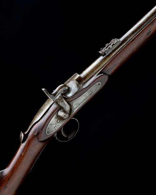 dated for 1874, with 25in. barrel, the breech end marked 'WHITWORTH RIFLING' (some pitting), block and blade fore-sight, elevating ladder rear-sight, lift-up trapdoor action stamped 'MANUFACTURED BY WESTLEY RICHARDS' together with the 'triangle' trademark, plain lockplate signed 'WESTLEY RICHARDS & Co.' together with the date '1874' in a triangle to the tail, walnut full-stock with iron furniture, iron barrel-band and provision for clearing rod (missing)