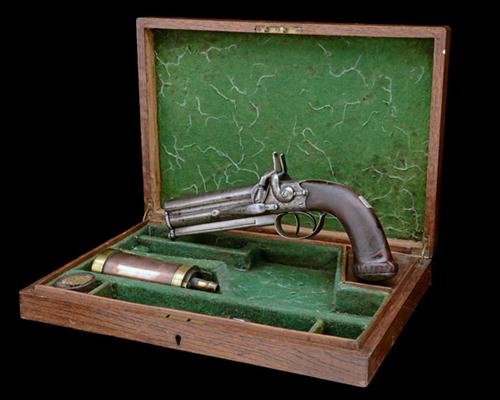 circa 1845, with 5 1/2in. barrels, engraved band at muzzles, carved oval percussion fences with screwed plugs, border-line and scroll engraved boxlock side-hammer action (one hammer replaced), the top-strap signed 'MOORE & WOODWARD, 64 ST JAMES ST LONDON' within a banner, sliding safes behind the hammers, scroll engraved top-tang (repaired), chequered walnut butt (broken through and repaired), iron dome-shaped butt-cap with central hinged trap-door, engraved trigger-guard bow, double-triggers and captive iron stirrup ramrod TOGETHER WITH a later wood box fitted out for this pistol and containing a number of accessories including a powder-flask