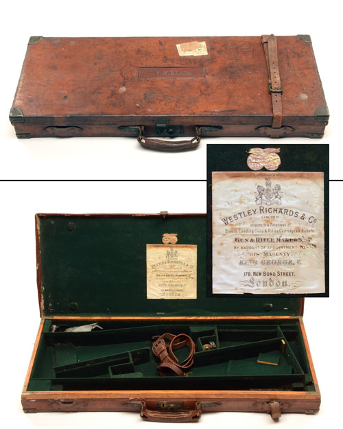 fitted for 28in. barrels (could adapt to 30in.), the interior lined with green baize, brass lock (key missing), the lid interior with a 'WESTLEY RICHARDS & CO.' trade label, the lid exterior with 'J.W. BLAIR'