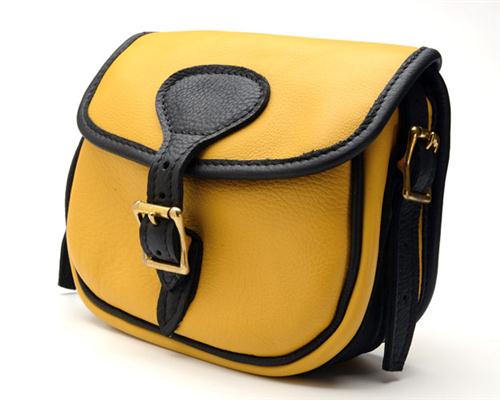 with yellow leather, canvas and leather shoulder strap, brass fittings
