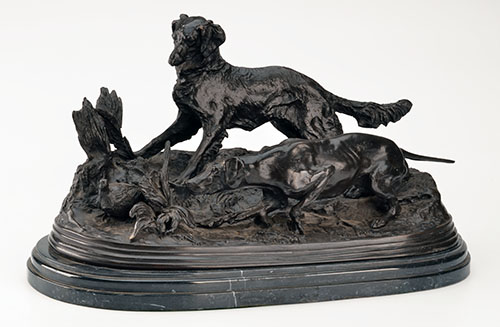 a setter and a pointer flushing a partridge in the undergrowth, mounted on a marble plinth, measure approx. 18in. x 8in. x 10in.