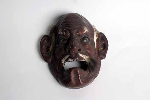 A JAPANESE LAQUERED CARVED WOOD AND PLASTER GROTESQUE WALL-MASK, probably circa 1850, of an old man, with glass eyes and applied natural hair (losses to finish and hair)