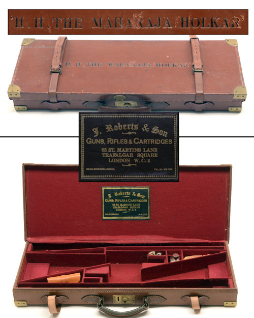 fitted for 26in. barrels (could adapt to 28in.), the interior lined with maroon baize, brass lock (including key), the lid interior with a leather gold tooled 'J. ROBERTS & SON' trade label, the exterior with 'H.H. THE MAHARAJA HOLKAR'