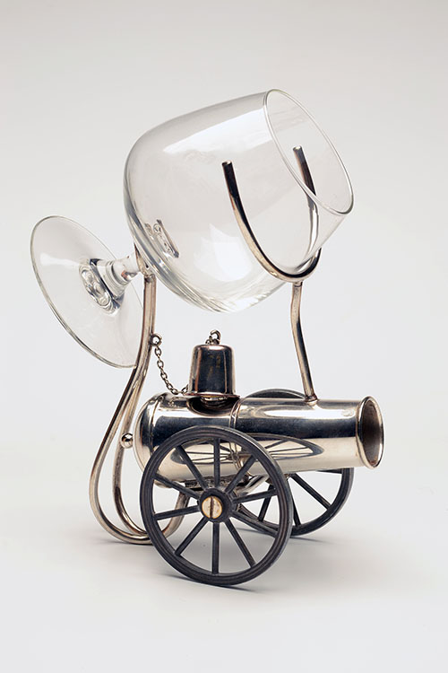 A SILVER PLATED BRANDY WARMER IN THE SHAPE OF A CANNON,