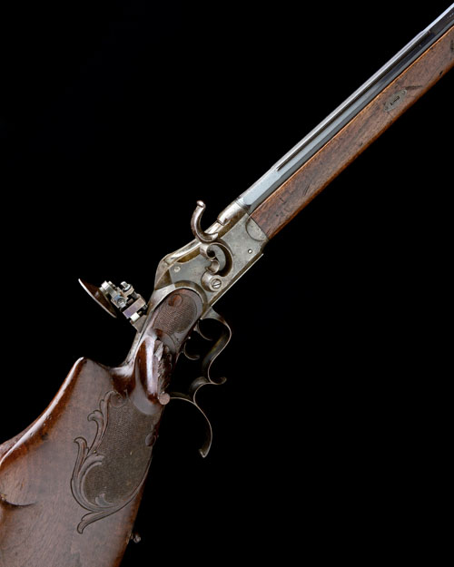 German, circa 1910, with blued octagonal 33 1/2in. barrel signed by the maker on the side-flats, the top-flat matted, adjustable dove-tailed blade ramp fore-sight, broad moulded dove-tail rail for rear-sight (absent), pierced 'C' scroll side-lever opening the breech with 'Martini' style dropping ramp, plain receiver (traces of colour), micro-adjustable pillar tang-sight with large iron eye-disk, replacement Tyrolean-style walnut butt-stock from another with Swiss-style iron heel-plate, complex trigger-guard bow with finger-spurs, double set triggers, plain fore-end with horn schnabel tip, iron sling-swivels