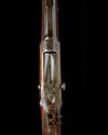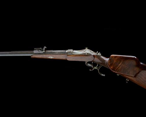 German, circa 1910, with blued octagonal 29in. barrel signed by the maker in silver inlay, the side-flats marked 'GUSS' and 'STAHL', colour-hardened dove-tailed blade ramp fore-sight with side protectors, broad moulded dove-tail rail for the micro-adjustable peep rear-sight, 'Martini' style dropping ramp to the breech, scroll engraved receiver (much colour), provision for pillar tang-sight (missing), Tyrolean-style walnut butt-stock with colour-hardened Swiss-style iron heel-plate, complex trigger-guard bow with finger-spurs forming the under-lever, double set triggers, plain fore-end with moulded schnabel tip, iron sling-swivels