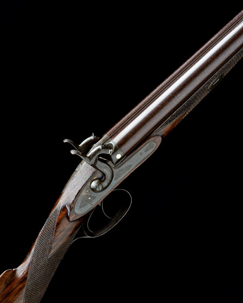 A 14-BORE PERCUSSION DOUBLE-BARRELLED SPORTING-GUN, no visible serial number,