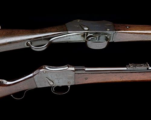 dated for 1878, with 33in. blued barrel, block and blade fore-sight, elevating ladder rear-sight, plain receiver with maker and model details, walnut butt-stock, short under-lever, walnut three-quarter length fore-end, iron furniture and provision for clearing-rod, (missing), the whole retaining much blued finish