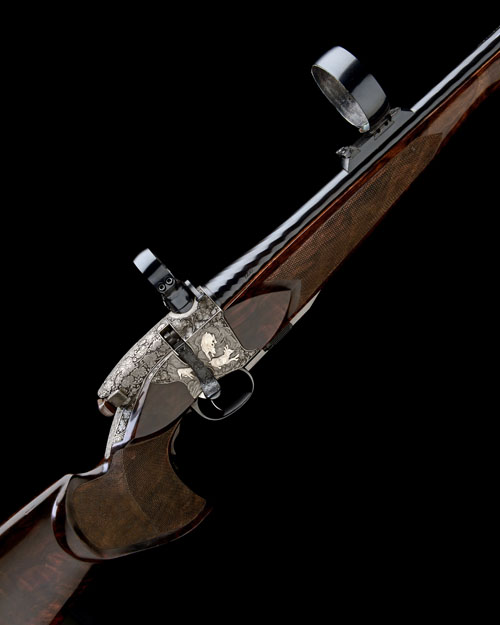 25 3/4in. nitro barrel with block-mounted folding open sights and ramp-mounted bead fore-sight, the breech end mounted with telescopic sight rings in quickly-detachable mounts, Johannes Kepplinger patent action, patent no. DE29904414 of 3rd October 1999, detachable box magazine, sprung safety with additional grip safety, set trigger, fully carved in high relief with scrolling foliate motifs on a matted background, surrounding woodland scenes with silver highlighted quarry, 15in. highly-figured pistolgrip stock with sculpted pistolgrip and cheekpiece, sling swivels and including 1/2in. rubber recoil pad