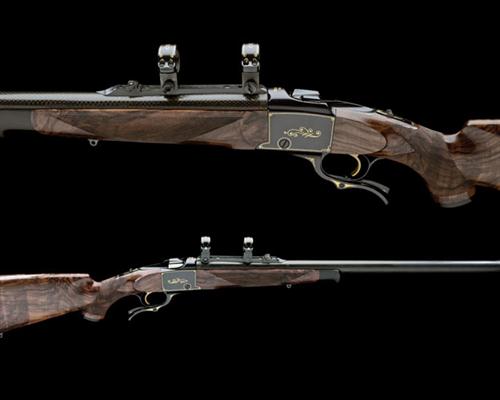 27 5/8in. nitro reproved carbon fibre wrapped barrel with detachable titanium muzzle break (26in. without muzzle break), the breech end mounted with gold-inlaid telescopic sight rings on a scroll engraved sight rib, folding adjustable open sights, manual tang safety, blacked action with gold highlights, gold-washed trigger, 13 5/8in. highly-figured pistolgrip stock with sling eyes, pistolgrip-cap and buttplate, highly-figured fore-end with sculpted darkwood finial, weight 7lb.