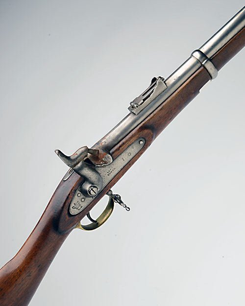 A .577 PERCUSSION SMOOTH-BORE MUSKET SIGNED TOWER, MODEL 'PATTERN 1856', serial no. 160, probably for India or the colonies and dated 1865, with 39in. sighted barrel marked 'NS' over 'AMR', tower proofs, military style lock with 'VR' and crown, walnut three-quarter stock, brass furniture and three iron barrel-bands, iron ramrod