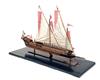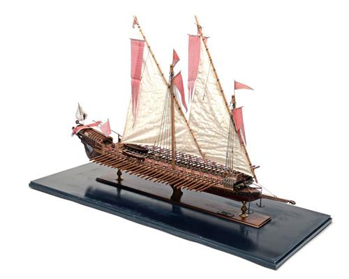approx. 42in. overall and 32 1/2in. on the waterline, reasonably accurate construction with individual planks on hardwood frames and floors, detailed fittings in brass, wood and lost-wax castings, twin-masted with both lateen sails set together with various command and battle pennants, 30 pairs of oars, 5 cannon beneath the rambade with 'ram bow' or stem forw'd, set on a wooden base with brass and wood pedestals, the whole within a later perspex and wood case