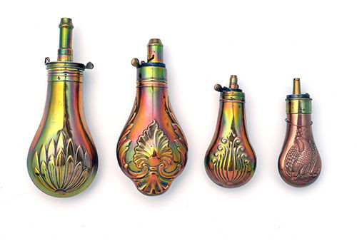 FOUR POWDER FLASKS OF SMALLER SIZE, mostly mid 19th century, one signed 'COLT', all heavily polished