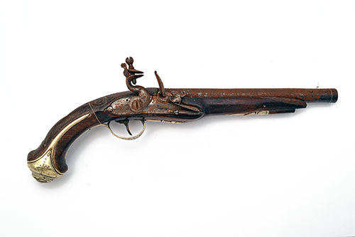 AN 18-BORE FLINTLOCK HOLSTER-PISTOL, POSSIBLY SIGNED 'MANO FRERES, DARDANELLES', no visible serial number, circa 1750 and decorated for the Ottoman market, with octagonal to round 9 1/2in. barrel (rusted), radiused signed lock with pointed tail, white metal furniture and scroll inlays, false ramrod, large piece of fore-end missing
