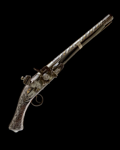 Algerian, circa 1800, with carved iron 11in. barrel, swollen muzzle engraved with naive foliage with a moulded plain ring band, the centre-section of the barrel with alternating inlaid chevrons of silver and brass, the voids between decorated with punched dots, the breech of octagonal form with silver washed engraved panels, engraved snaphaunce lock with silver panel inlays (top-jaw replaced, pan-cover missing), hardwood full-stock with flaring semi-faceted butt and engraved silver-capped pommel, the grip, side-panels and underside of stock inlaid with profuse silver wire scrolls and geometric devices, iron trigger-guard tang and bow with en-suite decoration, engraved white-metal barrel-band and brass wire ramrod