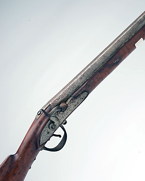 A 20-BORE PERCUSSION SINGLE-BARRELLED SPORTING-GUN, UNSIGNED, no visible serial number, circa 1840, with two-stage shortened 27in. barrel (obstruction in bore), bevel-edged lock converted from flintlock, continental-style walnut half-stock and replacement ramrod