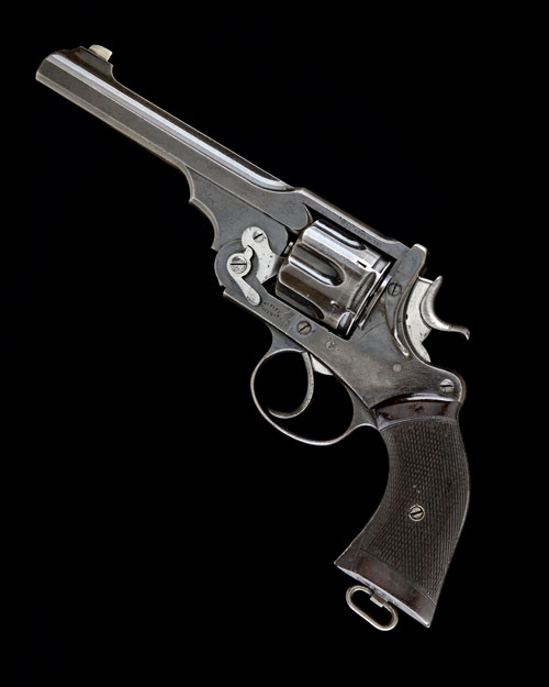 circa 1900, with 6in. barrel, nickel fore-sight, fluted cylinder, break-open frame with automatic ejection, chequered walnut flared grips and lanyard ring to heel, the base of grips bearing the Wilkinson serial number '9830'; COMPLETE WITH its manufacturers oak case, compartmented in red baize and bearing a parchment Wilkinson trade label to the inside of lid