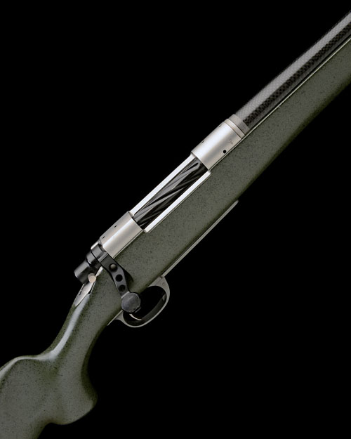 27 7/8in. unsighted nitro reproved carbon barrel including titanium muzzle break, receiver tapped for sight mount bases, hinged floorplate with push button release, satin finish, green speckle finish synthetic pistolgrip stock with sling eyes, 13 5/8in. pull including 1in. 'Limbsaver' rubber recoil pad