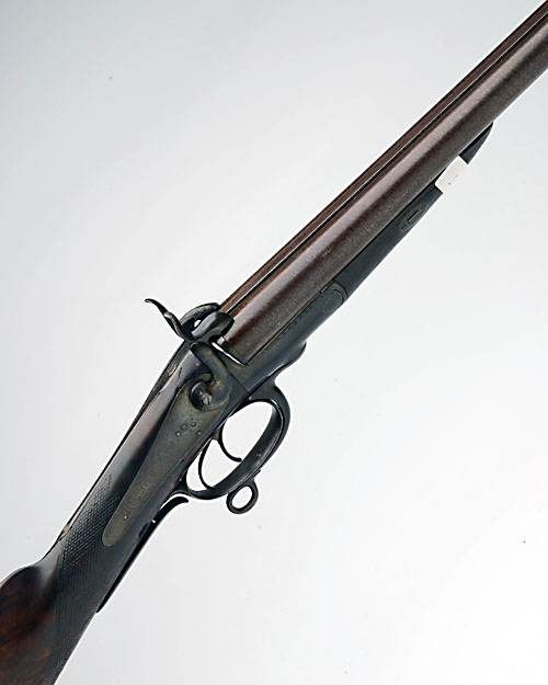 A 14-BORE PINFIRE HAMMER SHOTGUN SIGNED WAGNER, BERNE WITH BARRELS BY E.M. REILLY, no visible serial number, circa 1865, with 29 1/2in. barrels signed 'E.M. REILLY, LONDON', plain isolated locks signed 'WAGNER A BERNE', scroll engraved hammers, chequered walnut butt-stock, grip safe, swing under-lever action and chequered walnut splinter fore-end