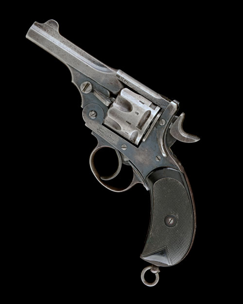 circa 1890, with 4in. barrel, crescent fore-sight, coin-release fluted cylinder with narrow locking notches, break-open frame with automatic ejection, chequered hard rubber birds-head grips (one chipped at heel), the backstrap stamped 'C.P. 22 485' (crossed out), the front-strap with 'C' broad arrow 'G', lanyard ring to heel, original much faded finish but retaining good 'two-tone' effect to frame