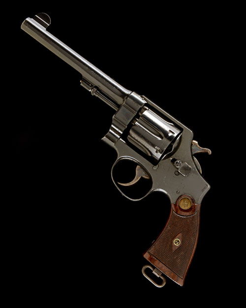 circa 1915, with blued 6 1/2in. barrel, crescent fore-sight, the barrel signed 'SMITH & WESSON SPRINGFIELD MASS USA' and with patent dates to 1906, sighting groove to the top-strap, swing-out fluted cylinder, solid frame, colour-hardened ancillaries and chequered walnut grips with inlet 'S&W' medallions to the tops, much original finish throughout