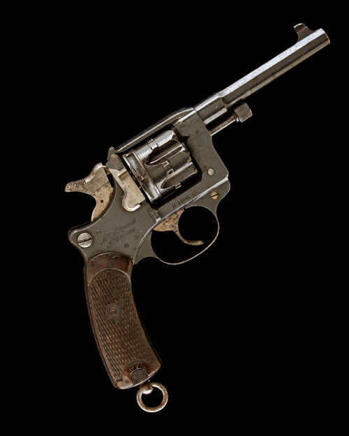 circa 1914, with two-stage 4 1/2in. unsigned barrel, blade fore-sight, sighting groove to the top-strap, swing-out cylinder, solid frame with auxiliary loading gate isolating the hammer and marked on the right hand side 'MLE D'ARMES ST. ETIENNE', hand detachable side-plate and chequered wood grip with lanyard ring at heel, original faded finish