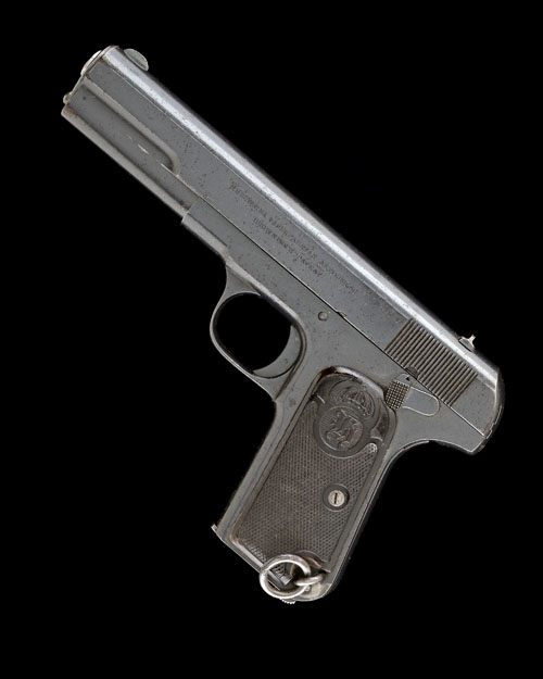 licenced copy circa 1914, with 5in. barrel, blacked slide with crescent fore-sight and dove-tailed notch rear-sight, the left hand side marked 'HUSQVARNA VAPENFABRIKS AKTIEBOLAG' over 'BROWNING'S PATENT', blacked frame, manual and grip safeties, chequered black hard-rubber grips with the 'Husqvarna.' trademark, lanyard ring to heel and heel magazine release, the whole retaining virtually all its original finish with some speckled surface spotting