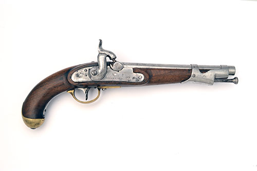 A .690 PERCUSSION SERVICE-PISTOL SPURIOUSLY SIGNED TOWER, serial no. 83, circa 1860, cut down from a French musket and made for colonial use, with 10in. barrel in the white, large musket lock stamped with an imitation Victorian crown, walnut three-quarter stock, brass butt-cap and trigger-guard, iron furniture parts