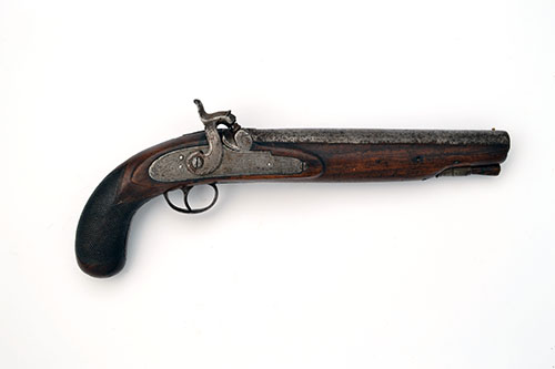 A 22-BORE PERCUSSION HOLSTER-PISTOL, UNSIGNED, no visible serial number,