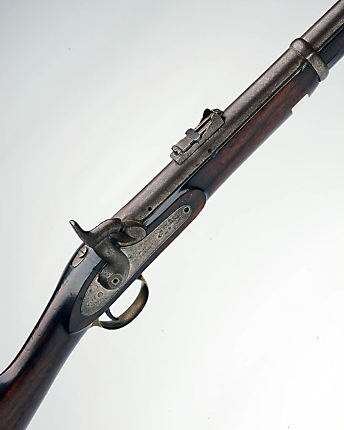 A .577 PERCUSSION CARBINE SIGNED TOWER, no visible serial number, dated for 1855, with 24in. sighted barrel (drilled through for wall hanging display only), borderline engraved lock with 'VR' cypher and signature, walnut three-quarter stock with two iron barrel-bands