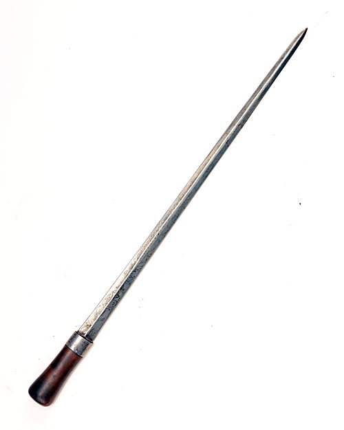 A BLADE FROM A GEORGIAN HUNTING HANGER, circa 1770, 22 3/4in. double edged blade with medial ridge (tip re-profiled), engraved with coats of arms and a central motto 'FOR MY COUNTRY AND KING' and fitted into a later wood hilt, no scabbard